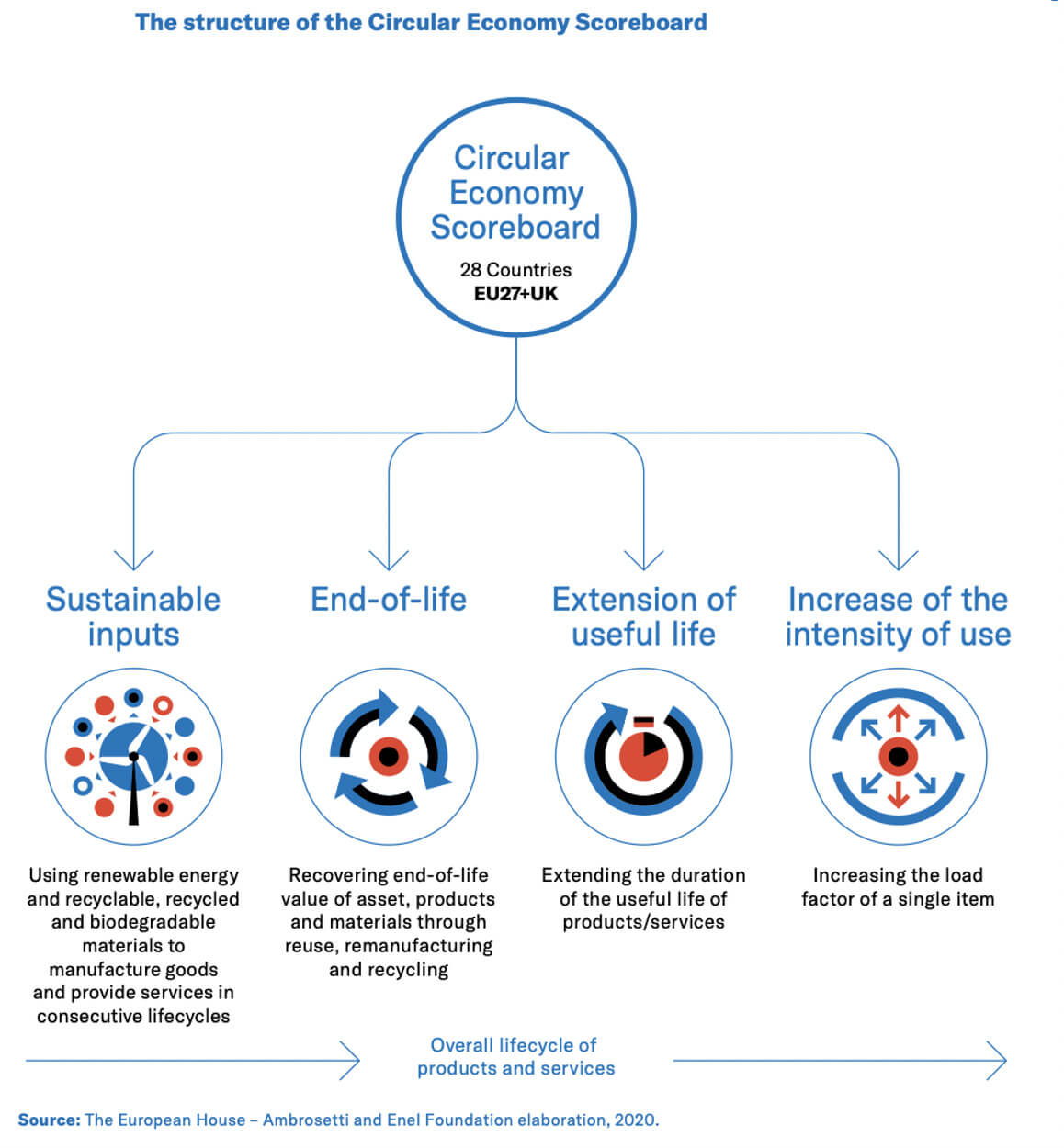 Dal Circular Economy Scoreboard emerge un’Europa eterogenea, con l’Italia che eccelle nella gestione del fine vita dei prodotti e con un buon posizionamento in termini di utilizzo di input sostenibili e di iniziative per estendere il ciclo di vita utile dei prodotti. Un paese come la Spagna presenta a sua volta un posizionamento importante in termini di utilizzo di input sostenibili, di gestione del fine vita dei prodotti e di aumento nell’intensità di utilizzo, mentre la ricerca segnala una minore focalizzazione in termini di estensione della vita utile di prodotti e servizi.