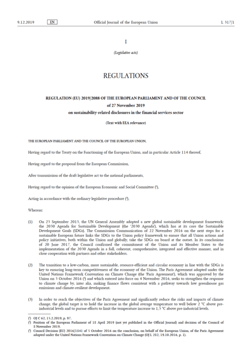 Il Regolamento 2088 del 2019 è stato approvato il 27 novembre 2019 e ha come obiettivo la regolamentazione del reporting relativo ai temi della sostenibilità nei servizi finanziari.