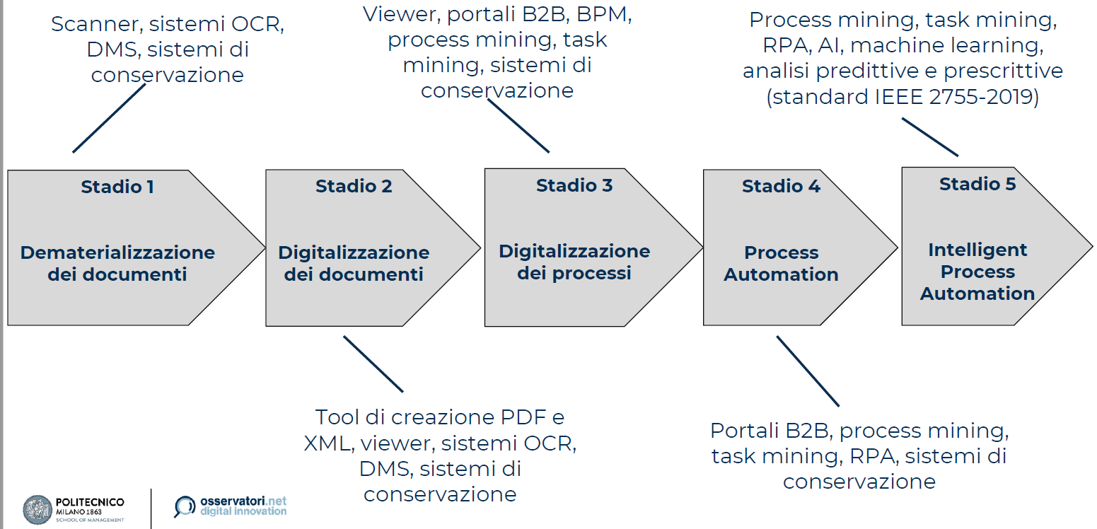 La digitalizzazione è senza dubbio supportata dalla tecnologia, in un’ottica di evoluzione e automazione. Nell’infografica che segue possiamo cogliere i diversi stadi e le azioni correlate. Evitando di commentare ogni singolo passaggio, ciò che si evidenzia è come si possa partire da un primo passo con la dematerializzazione dei documenti fino ad arrivare a dei veri e propri sistemi di automazione intelligente con azioni predittive e correttive.