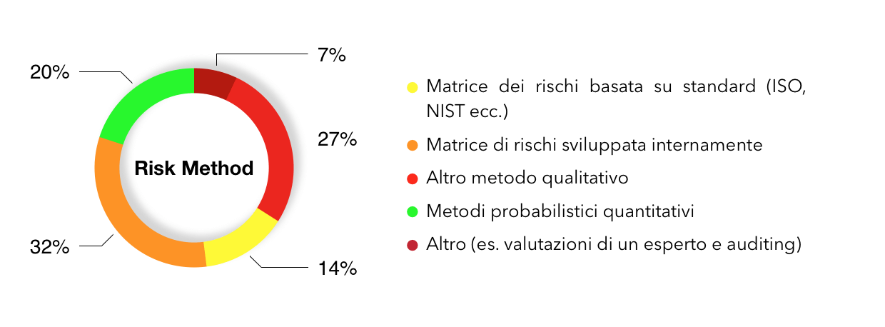 Il dato forse più sorprendente è che il metodo più usato in assoluto è la matrice di rischio qualitativa sviluppata internamente, che supera di gran lunga per utilizzo la matrice di rischio basata su standard internazionali.